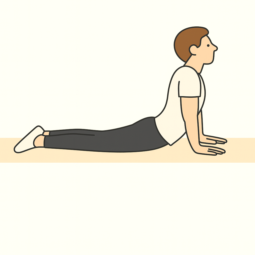Gently lift your chest and upper body using your forearms while keeping your hips and legs on the floor. Hold this position for 10–15 seconds, then slowly lower back down.